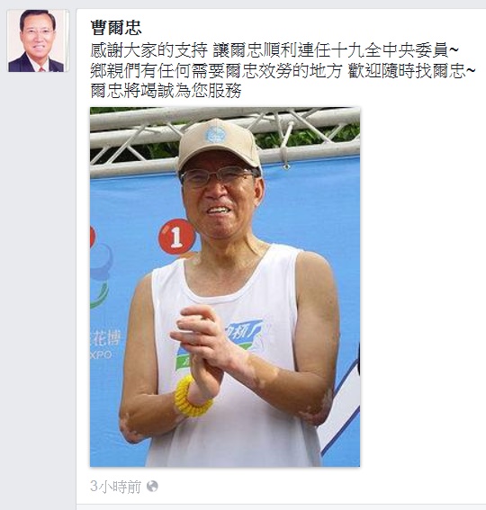 曹爾忠臉書報喜訊:連任國民黨第19屆中央委員 --閱讀人次 : 1605 本站訊: