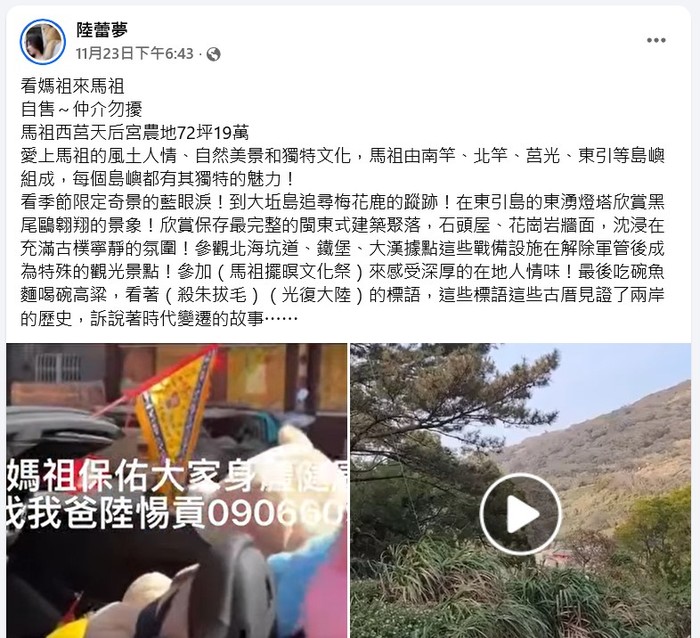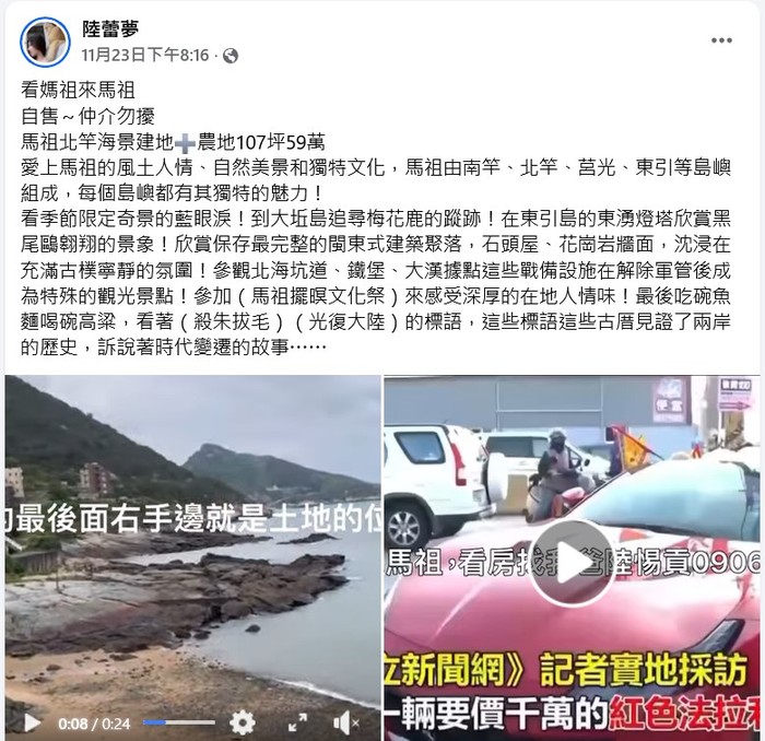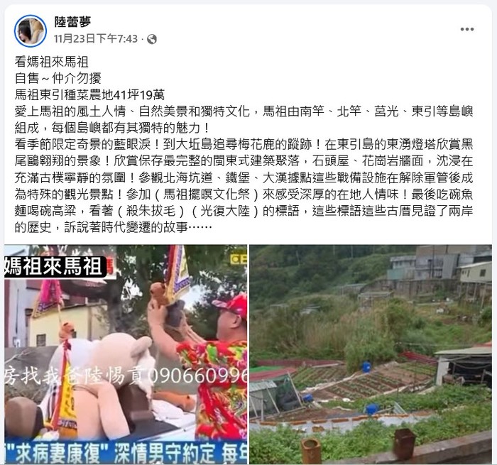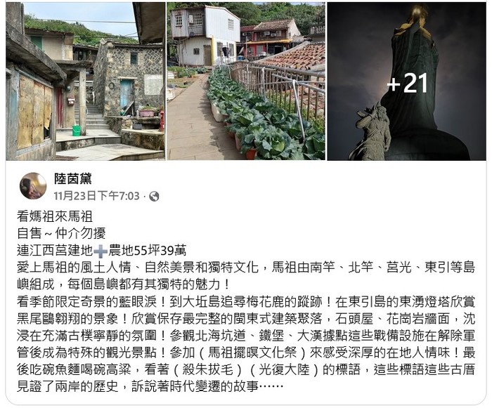 最近臉書經常出現出售馬祖土地的廣告,包括西莒田沃、南竿天后宮旁、東引遊戲帝國旁都被選中,臉書附上土地照片和影片,土地的售價約數十萬元,價位不高。據了解,這個詐騙的目的是要騙訂金,目前馬祖尚未出現受害者。