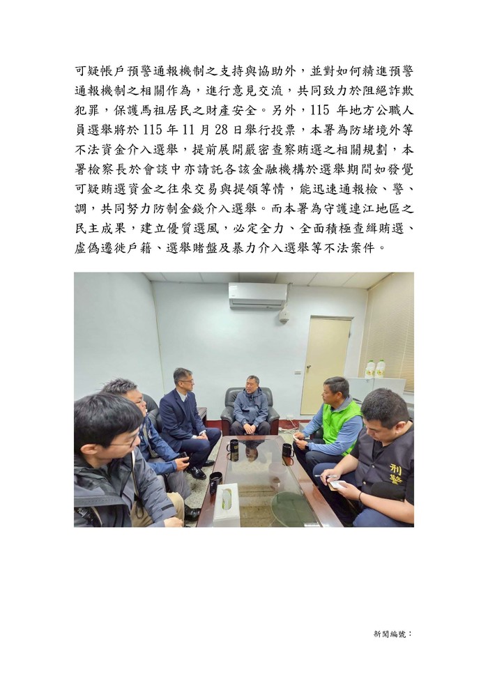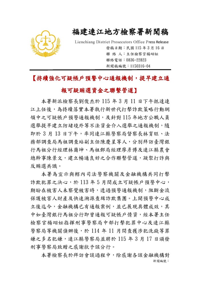 連江地檢本署持續強化可疑帳戶預警中心通報機制,提早建立通報可疑賄選資金之聯繫管道