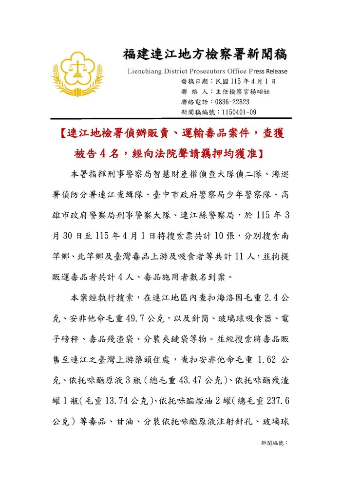 115/04/01連江地檢偵辦販賣、運輸毒品案件新聞稿