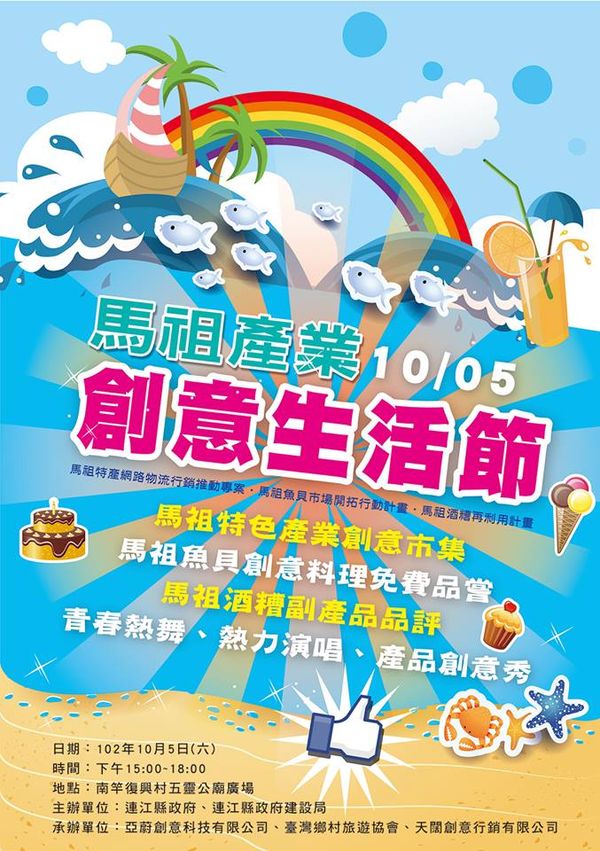 由連江縣政府建設局主辦「馬祖產業創意生活節」,10/5下午3點到6點將於復興村五靈宮廟前,展開一系列精采的動靜態活動及展演,主場活動包含由東方洋舞團精心準備的熱力舞蹈、五星級主廚的馬祖魚貝料理免費吃到飽、酒糟新創產品發表,淡菜殼創意DIY、馬祖特色產業創意市集,以及「馬祖點心故事」微電影試映會,活動精采絕對讓您絕對讓您一猶未盡,有吃有喝又有得玩!