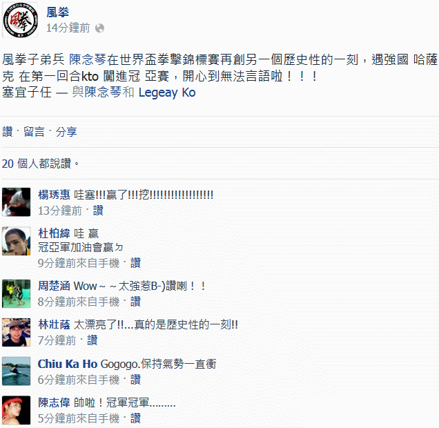 代表我國赴保加利亞參加世界盃青少女拳擊錦標賽,陳念琴在75公斤級的四強賽中,今晚再傳佳音,第一回合就技術性擊倒(TKO)強敵哈薩克對手,再次獲得空前勝利,為國爭光,也為馬祖爭光,已順利闖進冠亞賽!並且,這是有史以來台灣第一人進世界盃青少女拳擊冠亞賽!