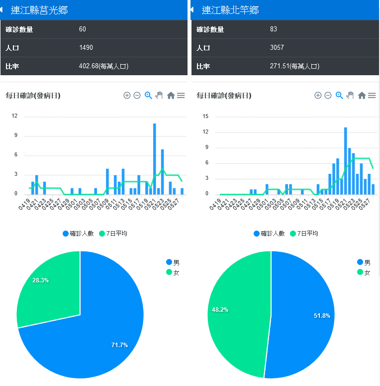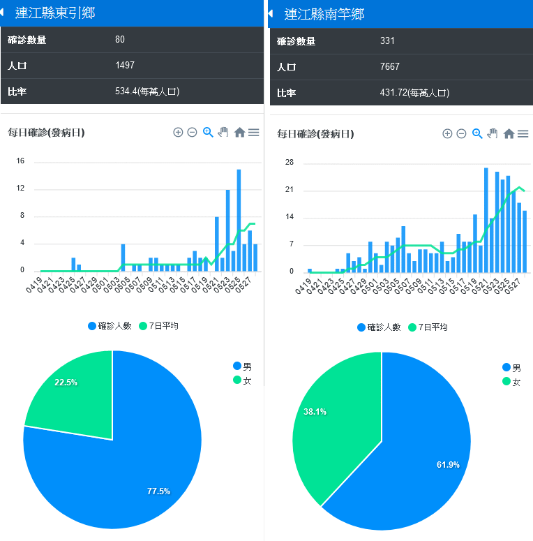 最早由莒光鄉領先的新冠肺炎確診率,先被南竿鄉趕上,最近又被東引鄉超越了。依據中央疫情指揮中心的資料統計,截至5月28日為止,東引鄉已有80人確診,每萬人有534.4人確診,等於每百人5.34人確診。事實上,東引實際居住人口不到千人,因此實際的確診率已接近每10人就有1人確診,疫情十分嚴峻。