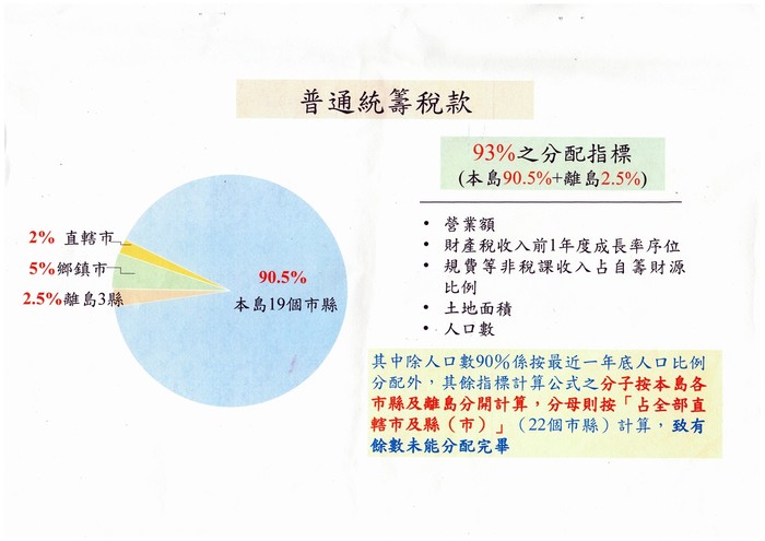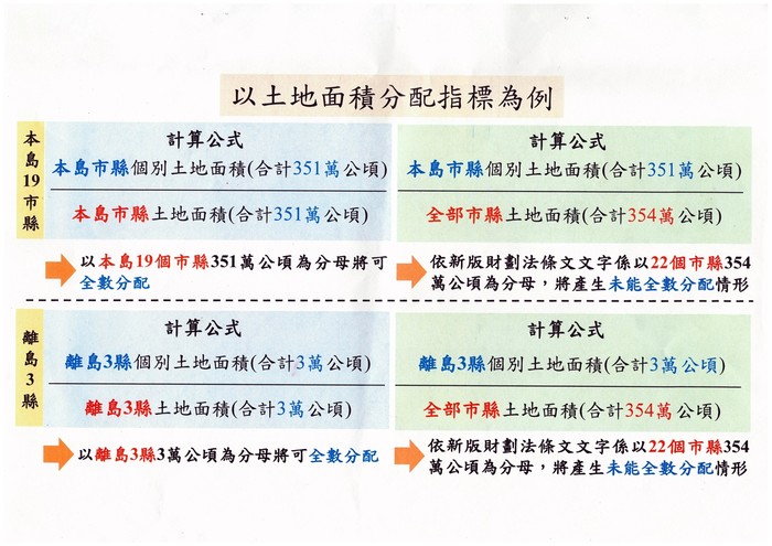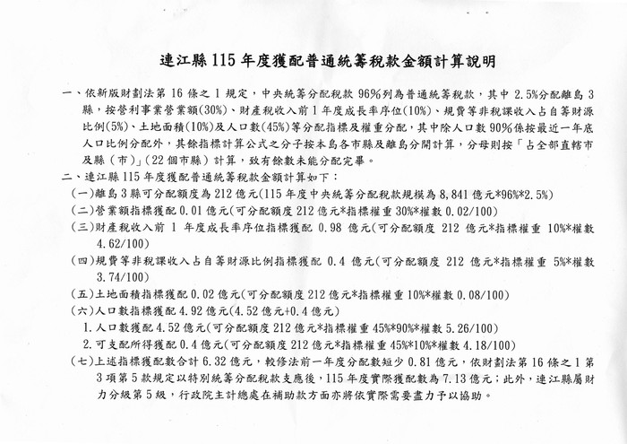 陳雪生指出,在有關新版財劃法的研商會議中,針對第16條之三離島的計算方式,細算後發現連江縣的分配額度,低於原本試算的33億元。由於16條之三仍是以人口與面積為加重核算,在舊版財劃法中,連江與金門的人口比例於89年時,僅相差3.2倍(當時金門人口56,375人、面積151.7平方公里;連江17,775人、面積28.8平方公里);但如今金門人口已是連江的11倍,澎湖也多出8倍人口,加上金、澎兩縣的面積又是連江的5倍,使得連江縣在統籌分配稅款上大幅減少。