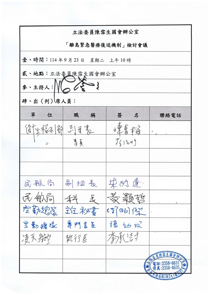 今(23)日上午10時陳雪生特別邀集衛生福利部、民用航空局、空中勤務總隊、連江縣衛生局(因颱風因素以視訊與會)、凌天航空公司等單位,於立法院召開離島緊急醫療後送機制檢討會議,澎湖、馬祖等地皆面臨相同困境,基於地方財力有限與離島特殊環境,經本次會議討論獲致以下結論: