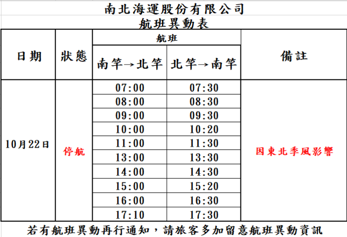 10/22【南北海運】-南北竿航線 停航 --閱讀人次 : 818 本公司經營南竿往返北竿航線,因受強烈東北季風影響,海象不佳