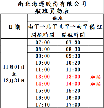 11/1-12/31【南北海運】南北竿航線 --閱讀人次 : 2477 【班次加開通知】