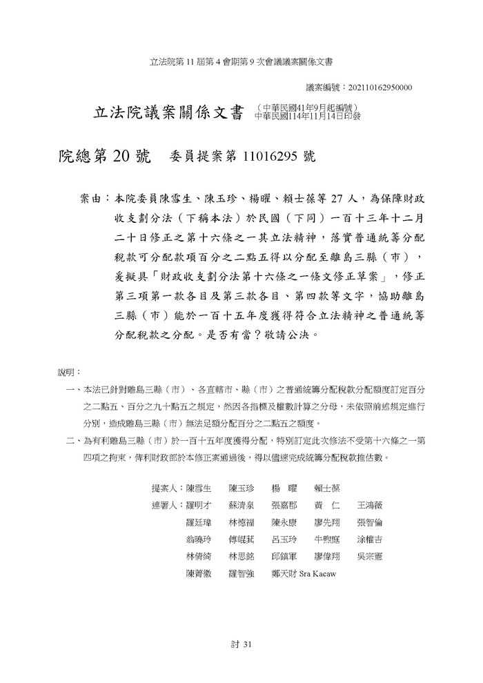 立法院今(21)日下午三讀通過《財政收支劃分法》第十六條之一修正條文,確保離島三縣(市)能於115年度依照立法原意,取得普通統籌分配稅款百分之二點五的保障額度。本案由立法委員陳雪生、陳玉珍、楊曜、賴士葆等27位立委共同提案,並獲全體委員支持完成三讀。