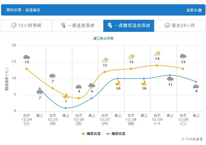 中央氣象署預報,馬祖地區25日溫度最低9度,體感溫度最低1度,後天(26)日體感溫度4度,這兩天都很冷,請留意保暖。
