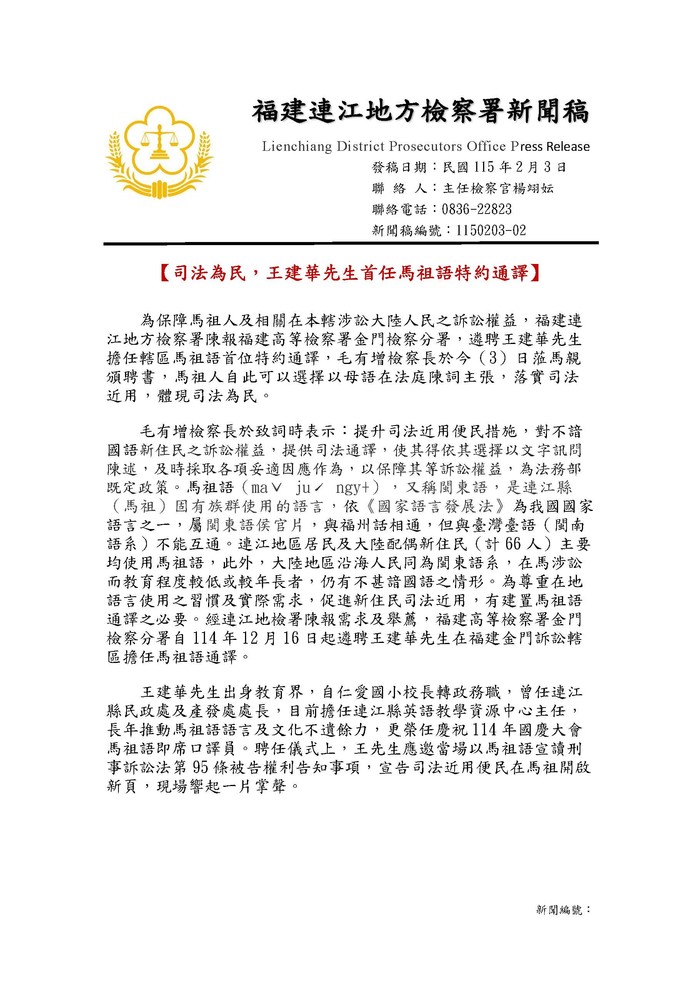 115/2/3連江地檢署新聞稿-首位馬祖話通譯
