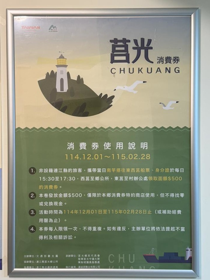 1. 非設籍連江縣的旅客,攜帶當日南竿搭往東西莒船票、身分證,於每日15:30至17:30,西莒至鄉公所、東莒至村辦公處領取面額$500的消費券。