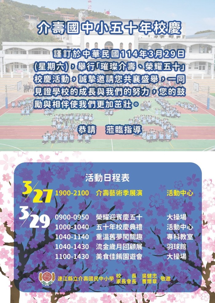謹訂於中華民國114年3月29日(星期六),舉行「璀璨介壽、榮耀五十」校慶活動,誠摯邀請您共襄盛舉,一同見證學校的成長與我們的努力,您的鼓勵與相伴使我們更加茁壯。