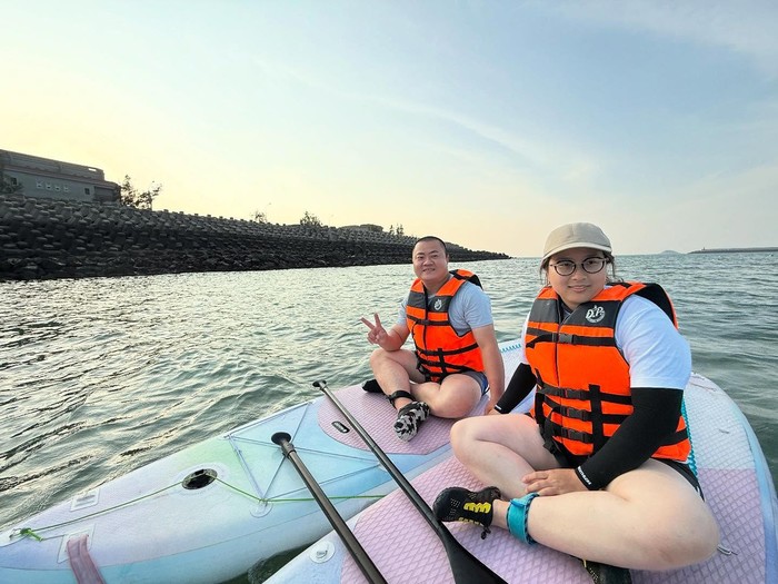 陽光灑在水面上閃閃發亮,吹著風、划著板,整個人都放鬆了~