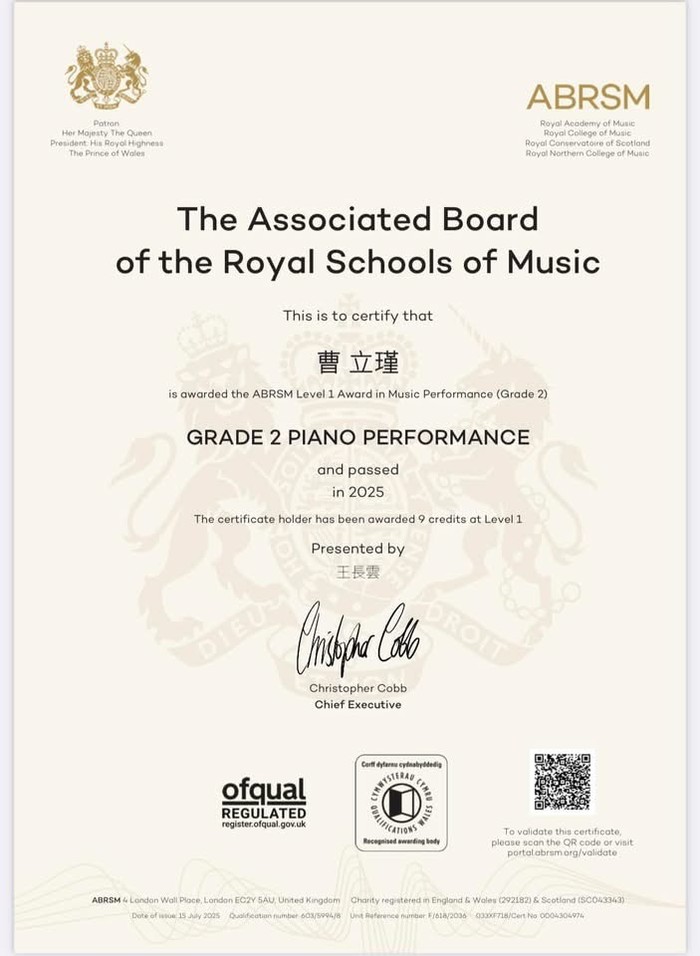 恭喜6歲的曹立瑾通過英國皇家鋼琴檢定第二級 --閱讀人次 : 1267 🎹小小鋼琴家的大大堅持!💪🏻6歲的立瑾通過英國皇家音樂鋼琴檢定第二級】🎶