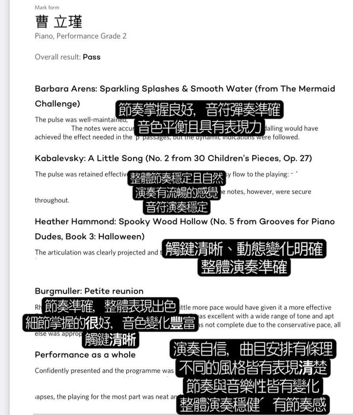 最終,他還是成功通過考試!評語裡提到他的演奏是「穩健的」,這對於一位六歲孩子來說,真的非常了不起。