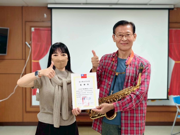張先生是第七處前處長,少將退役,退休後進修薩克斯風,深入學習音樂後,並本著熱情及以音樂共伴長者的意念,至各榮家、老福機構以分享音樂會方式鼓舞長者,融入音樂中律動、歌唱,讓身心靈都獲得從美好樂音而來的快樂!