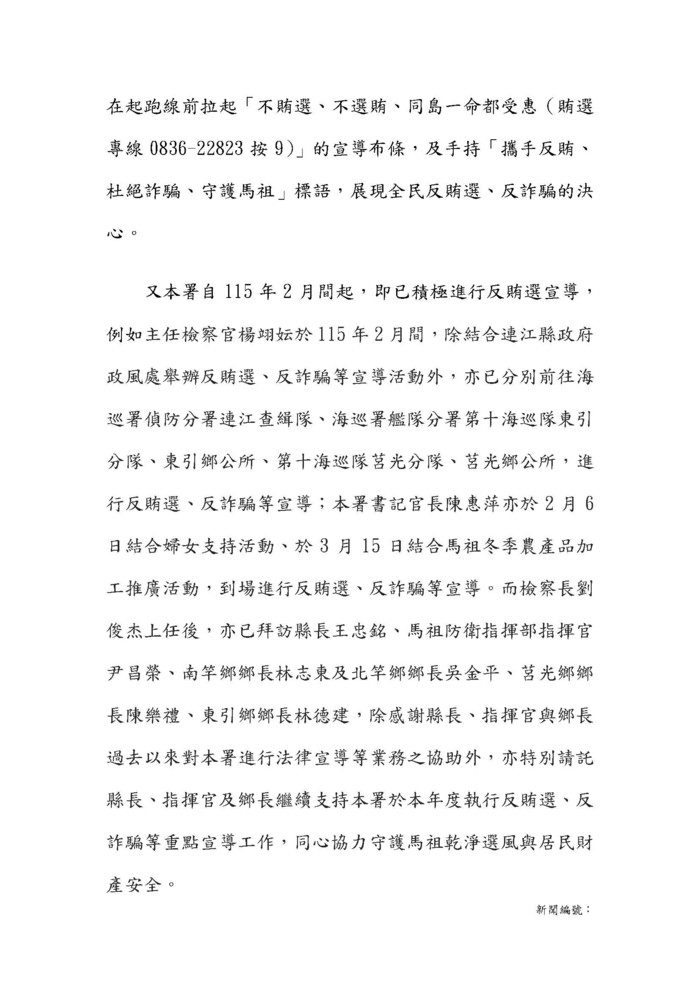 本署訂定反賄選宣導計畫,全面推廣「馬祖攜手反賄選、勇敢檢舉護家園理念】