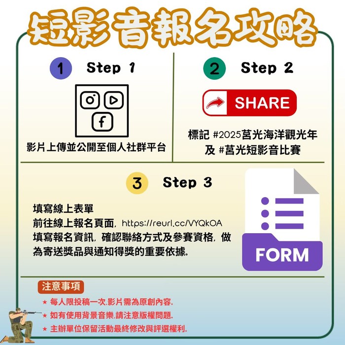 ✔ 作品必須為自行拍攝,不得使用網路素材或他人影片