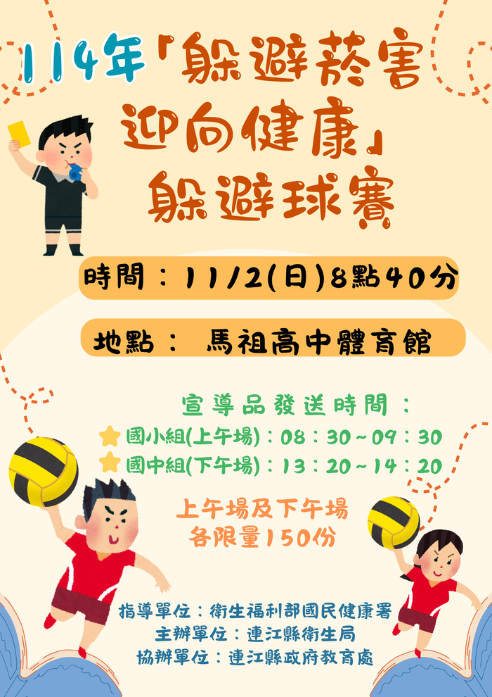 114年「躲避菸害 迎向健康」躲避球賽 --閱讀人次 : 513 一、目 的:呼籲學生吸菸對於人類的害處,進而拒絕吸菸以杜絕其害。本活動乃藉由運動以彰顯香菸對人的各種活動能力之危害,以躲避球賽吸引學生參與,在活動過程中體認吸菸對身體的危害,以及所產生的二手菸、三手菸亦對身邊的人造成影響,且近年吸電子菸比率逐漸上升,電子菸無法幫助住戒菸,對身體危害更大,希望藉由活動的呼籲能將拒絕吸菸的理念能從小扎根。