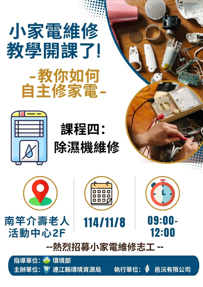 接續登場的年度最後一場課程「除濕機自己修」,將於11月8日(星期六)上午9時至12時,在南竿鄉介壽老人活動中心開辦。