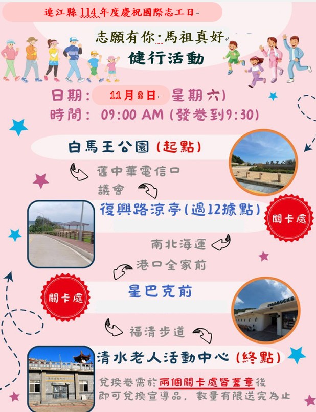 聯合國大會於1985年宣布每年的12月5日為「國際志工日」,為響應國際志工日及感謝地區各界志工的付出,號召更多鄉親投入志願服務的行列,本縣特於11/08舉辦慶祝國際志工日-「志願有你·馬祖真好」志願服務暨社會福利宣導健行活動,邀請志工朋友們與鄉親一起來健走。