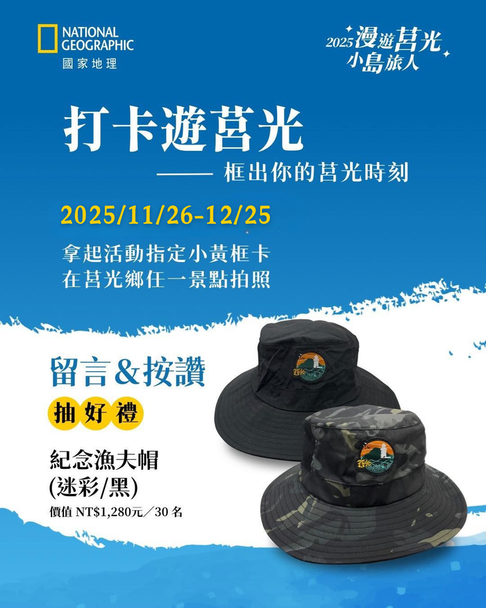 ※參與方式: 每月將不定期於《國家地理雜誌》Facebook 與 Instagram 官方粉絲專頁發布小知識問答,旅人只要留言互動,就有機會抽中專屬紀念後背包與紀念漁夫帽!