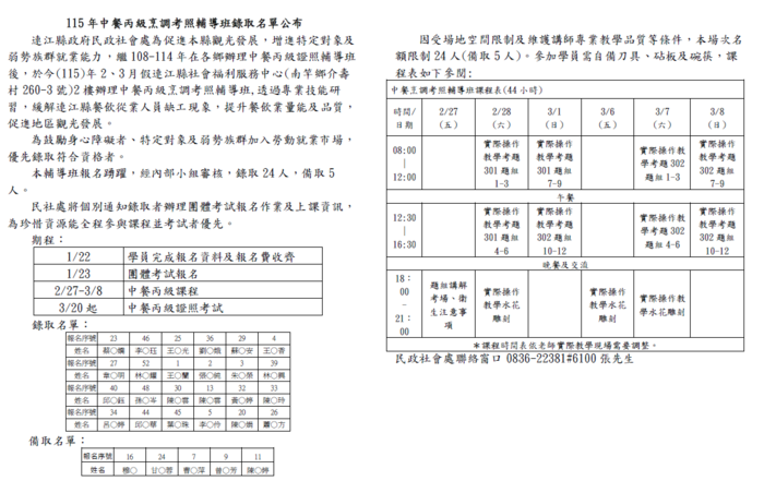 115年中餐丙級烹調考照輔導班錄取名單 --閱讀人次 : 1625 115年中餐丙級烹調考照輔導班錄取名單公布