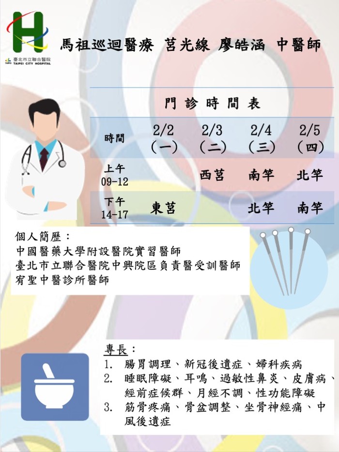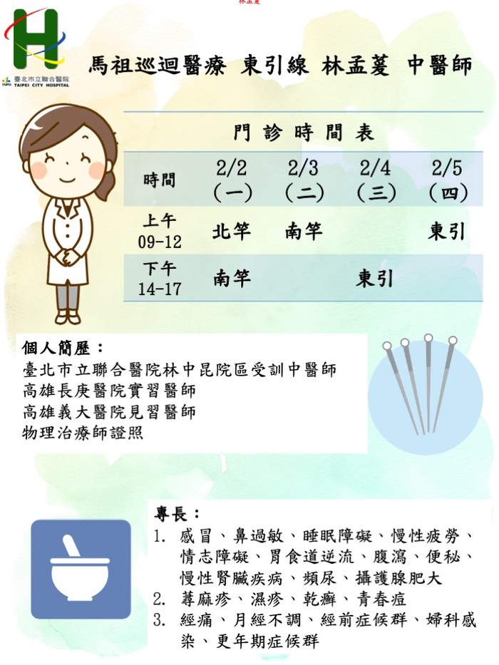 馬祖中醫巡迴醫療2/2–2/5由莒光線廖皓涵醫師、東引線林孟萲醫師前往支援服務。