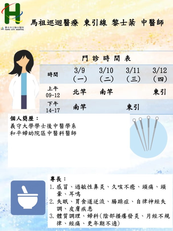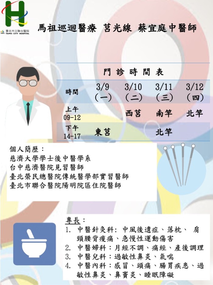 馬祖中醫巡迴醫療3/9–3/12由莒光線蔡宜庭醫師、東引線黎士棻醫師前往支援服務。