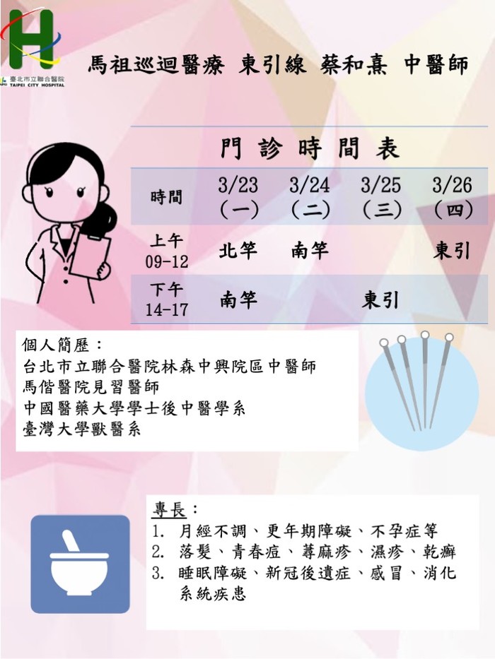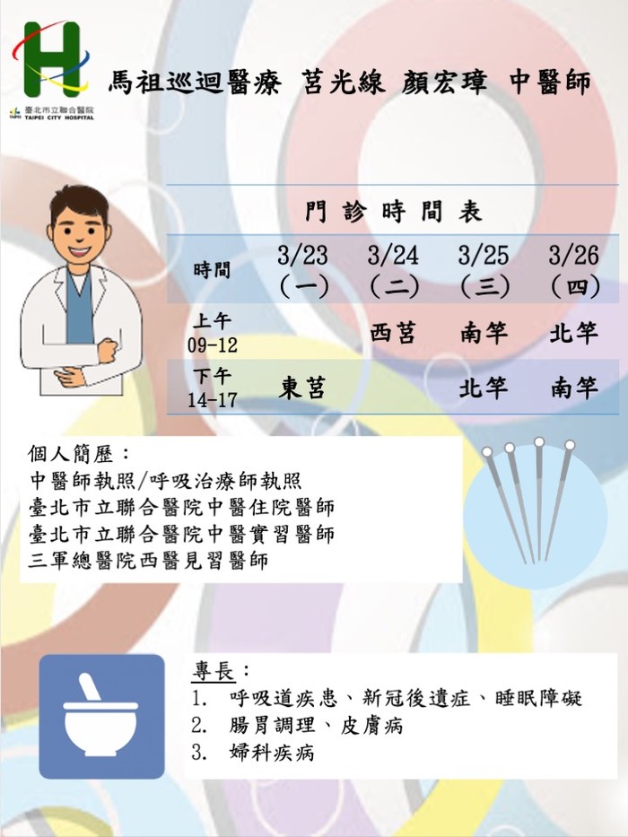 馬祖中醫巡迴醫療3/23–3/26由莒光線顏宏璋醫師、東引線蔡和熹醫師前往支援服務。