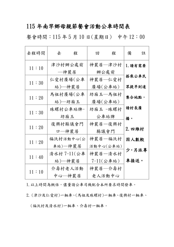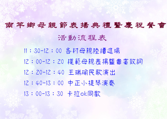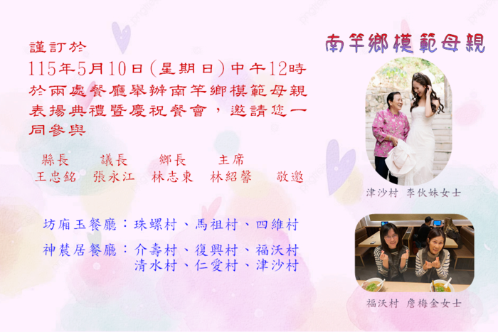 為慶祝115年母親節,南竿鄉公所訂於5月10日(星期日)中午12時舉辦南竿鄉模範母親表揚典禮暨慶祝餐會活動,邀請地區媽媽們一同參加。