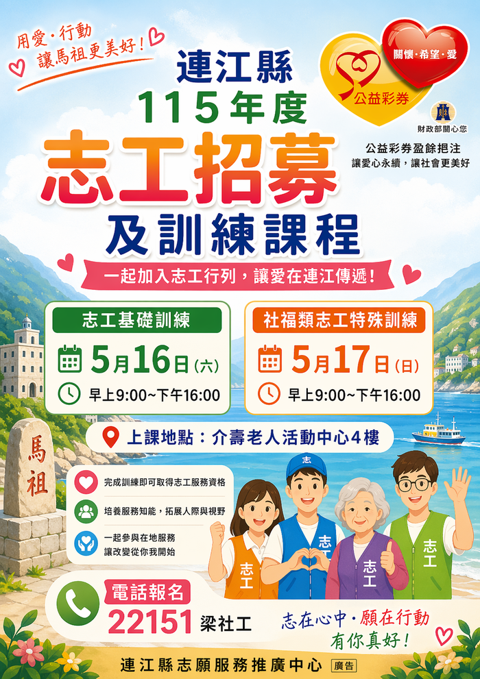 連江縣115年度志工招募及訓練課程 --閱讀人次 : 444 連江縣115年度志工招募及訓練課程