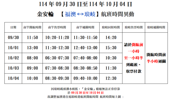 09/30-10/04【金安輪】琅岐航班異動 --閱讀人次 : 1388 🚢 【航班時間調整公告】