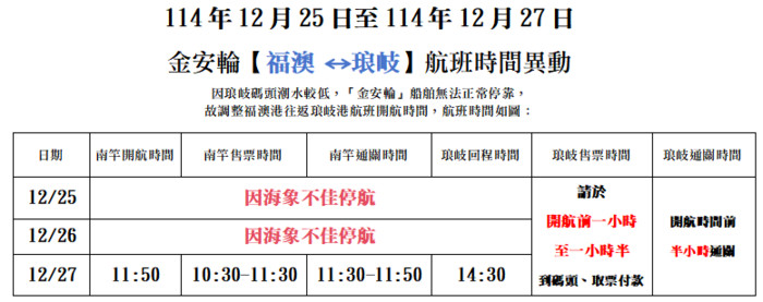 因琅岐港潮水較低,為優先考量航程安全並確保旅客搭乘順利,原定航班時間將進行調整。