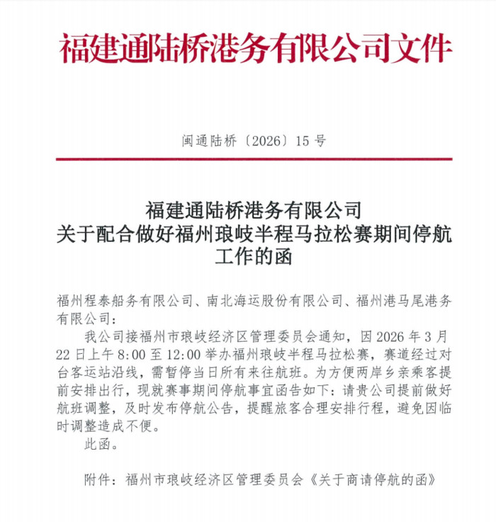 因福州琅岐於 115年03月22日 舉辦半程馬拉松賽事,賽道路線行經琅岐客運站周邊道路,陸方將實施交通管制。