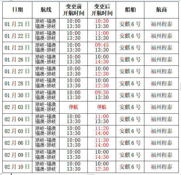 本輪受琅岐港潮位影響,異動開航時間如下,請欲搭乘旅客多加留意航班動態。