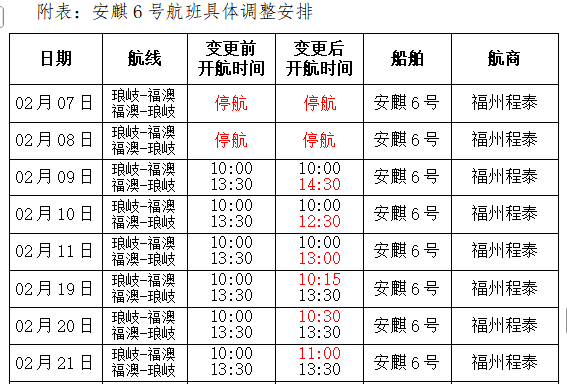 小三通琅岐航線(安麒6號)2/7-2/21停航暨航班異動公告 --閱讀人次 : 1569 各位旅客你好:本輪受琅岐港潮位影響,停航及異動開航時間如下,請欲搭乘旅客多加留意航班動態。