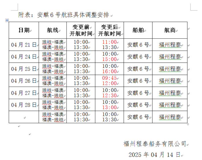 小三通安麒6號琅岐航線4/21-4/28航班異動公告