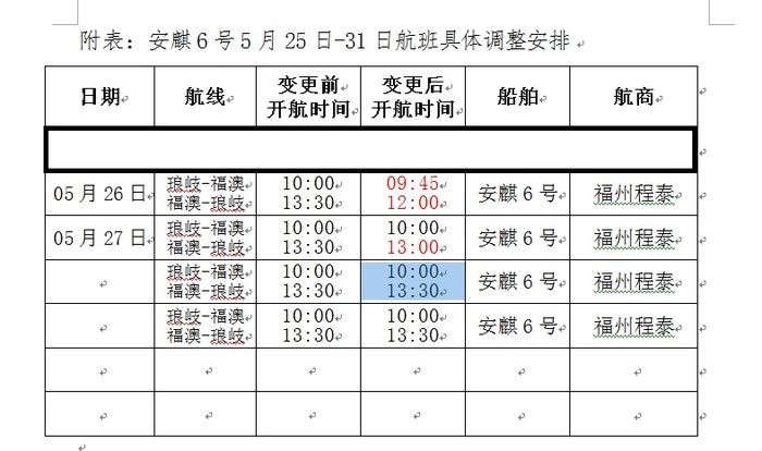 小三通琅岐航線(安麒6號)5/25-5/31航班異動