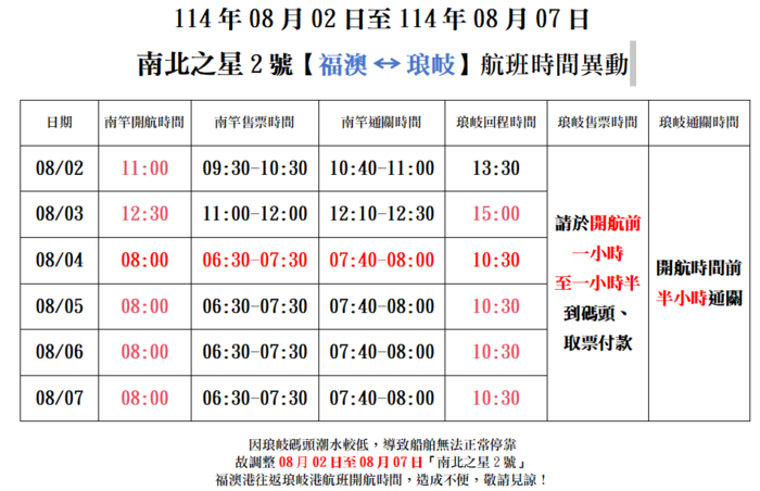 因114年8月02日至114年08月07日因受琅岐港潮水較低影響,