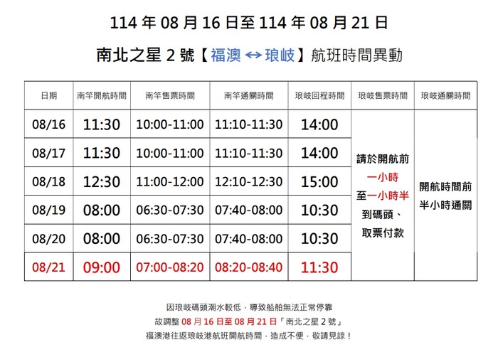 08/16-08/21 【南北之星2號】琅岐航班異動*更新* --閱讀人次 : 1675 🚢 【航班時間調整公告】*更新*