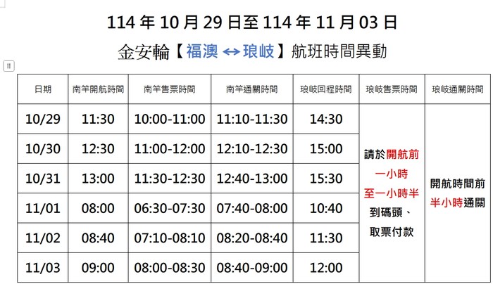 因琅岐港潮水較低,原定航班時間將進行調整,為優先考量航程安全並確保旅客搭乘順利,請旅客留意以下時程資訊: