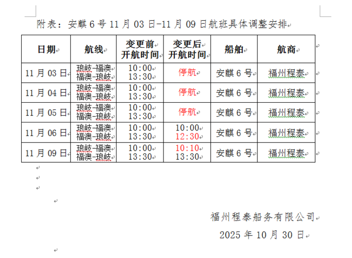 琅岐航線(安麒6號)10/27-11/16航班異動公告