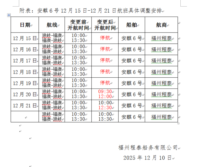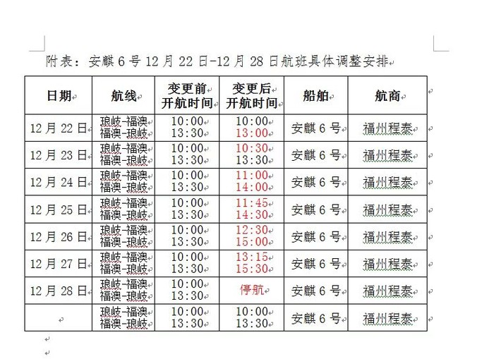 琅岐航線(安麒6號)12/12-12/28航班異動公告