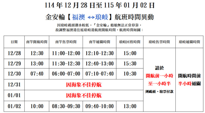 12/28-01/02【金安輪】琅岐航班異動