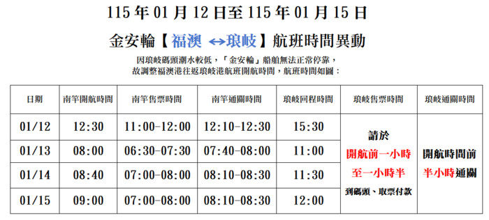 1/12-1/15【金安輪】琅岐航班異動