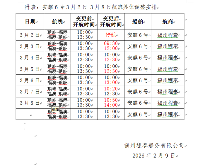 琅岐航線(安麒6號)2/16-3/8航班異動
