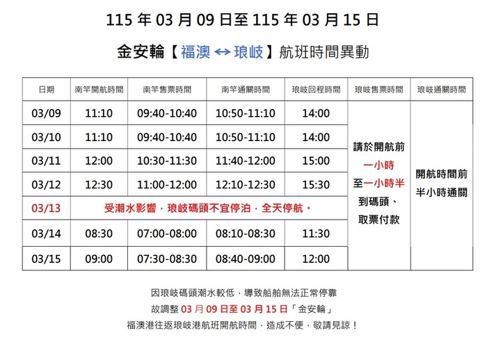 3/9-3/15【金安輪】琅岐航班異動 --閱讀人次 : 733 日期:115 年 03 月 09 日 ~ 115 年 03 月 15 日