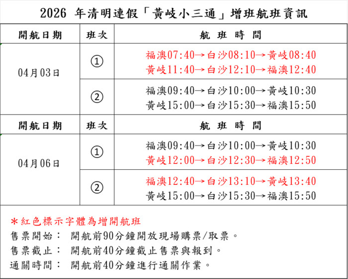 【南北海運】清明連假「黃岐小三通」增班航班公告 --閱讀人次 : 686 ✨ 加班航班公告