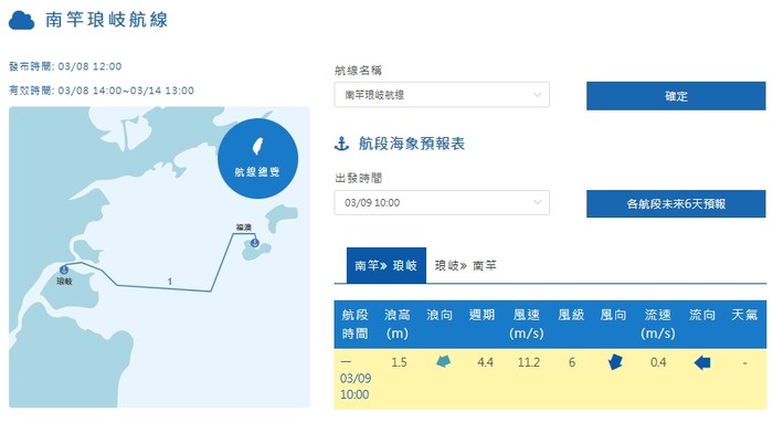 因交通部中央氣象署預報顯示,115年03月09日 因海象不佳,基於旅客安全及航行風險評估,本航線將於上述期間停航一日,敬請旅客留意並見諒。